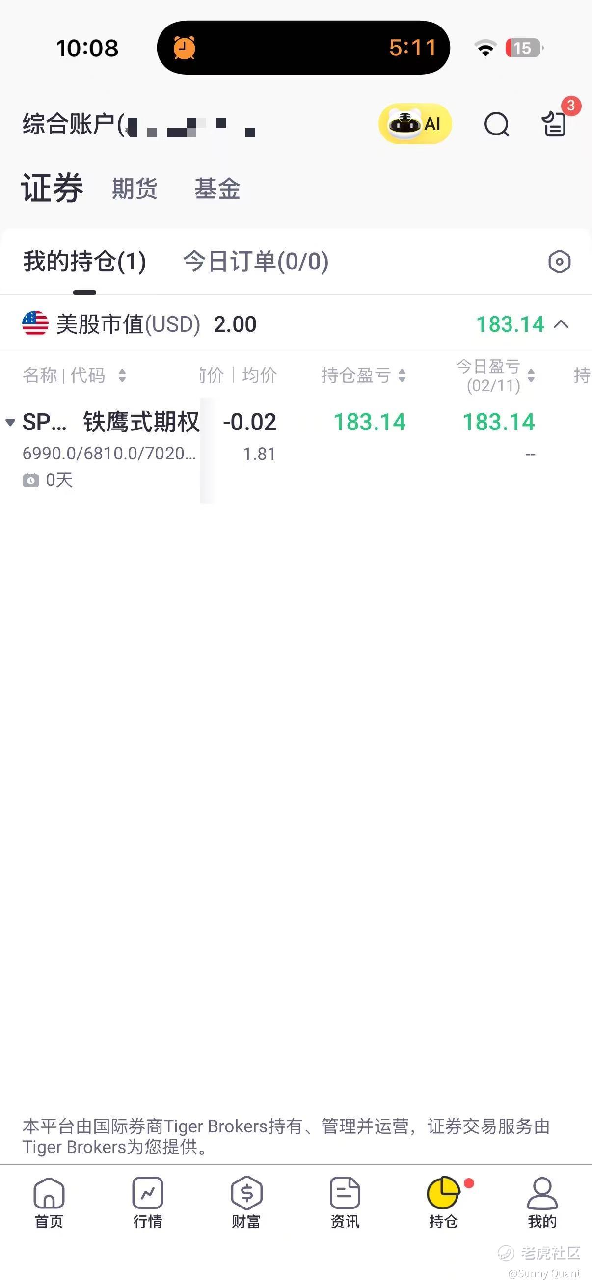 02.11 | 铁鹰获利,程序调试致部分空仓 实盘收益:+$183 【图片的今日收益似乎有问题,应该是老虎前两天算错钱,今天补算了】 策略组合:铁鹰 复盘:今日符合铁鹰的条件,根据信号质量程序自动建了1组铁鹰。盘中在我们机器上调试openclaw,不小心将其它策略程序停了一段时间,所以今天其它程序也没有建仓。 保持克制,明天见!✨