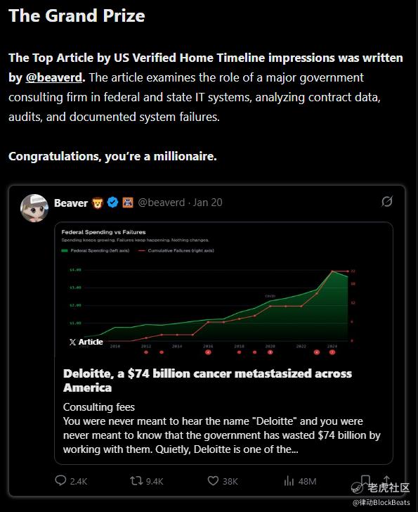 2 月 4 日,X 公布了百万美元文章竞赛的获奖者,@beaverd 凭借「Deloitte, a $74 billion cancer metastasized across America(德勤,740 亿美元的美国癌症)」成为了最终的优胜者,获得了 100 万美元的奖励。