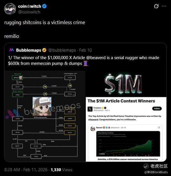 在英文圈,Beaver 也算是一个比较知名的 meme 币玩家,因此他的获奖让币圈感到振奋。但在前天,Bubblemaps 发表推文对他进行了指控,称他为一名「连环发盘手(serial rugger)」,通过操控币价获得了 60 万美元的利润。