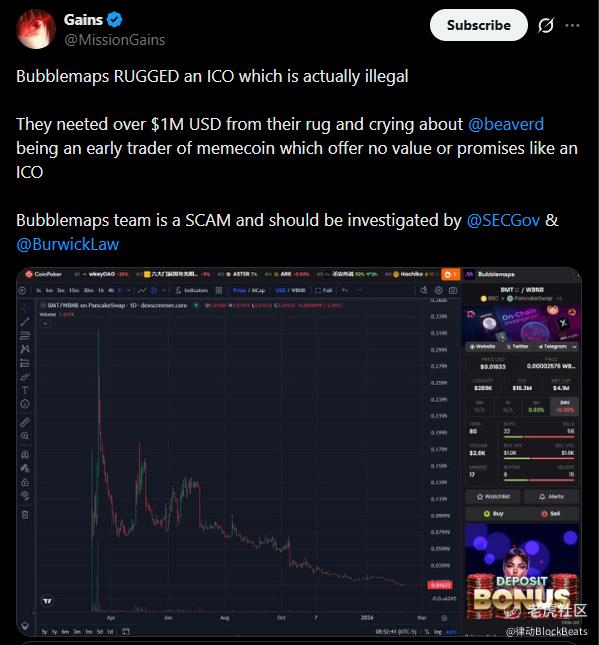站在 Beaver 这一边的玩家们甚至嘲讽 Bubblemaps 代币 $BMT 的市场表现,认为和 Beaver 相比,进行了 IC0、给出了承诺的 Bubblemaps 才是非法的骗局,是应该受到追责的那一方: