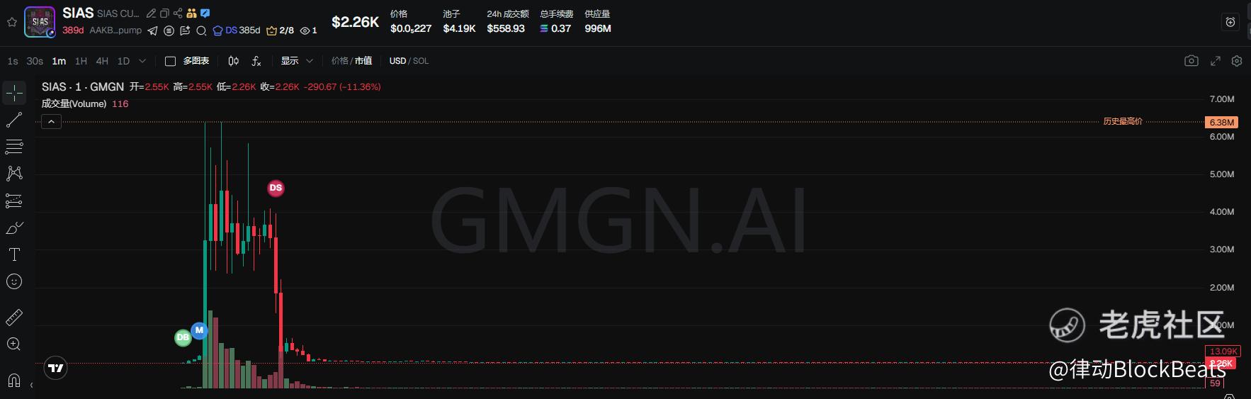 Bubblemaps 表示根据 Beaver 的公开 Solana 地址发现了关联地址「2mQB8o」,而该关联地址在 pump.fun 上发行了代币 $SIAS。$SIAS 在部署后的 7 分钟快速触及到了 600 万美元市值,然后又在接下来的 10 分钟后,因 dev 大额卖出而快速归零。
