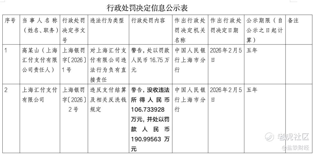 近日,中国人民银行上海分行公布了一则行政处罚信息,上海汇付支付有限公司(下称“汇付支付”)因违反支付结算及反洗钱相关规定,被依法处以警告,没收违法所得106.73万元及罚款191万元的处罚,合计罚没约298万元。