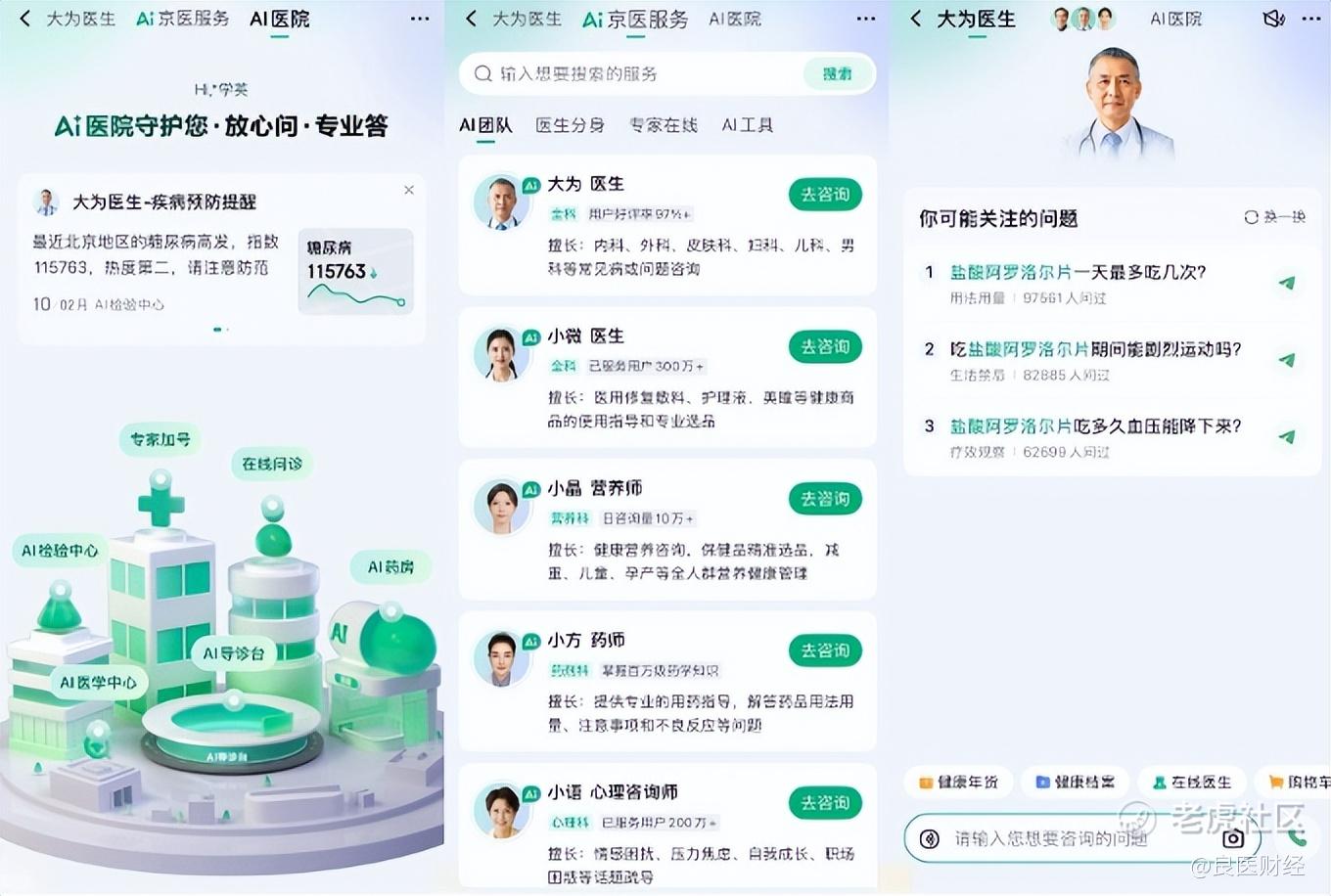 京东健康还全新升级了AI健康应用,旗下AI医生大为、AI营养师小晶等专业服务智能体,以及超过1500名来自全国400余家三甲医院的专家医生智能体,能为用户提供7*24小时不间断的在线导诊、问诊、报告解读、健康管理等服务。