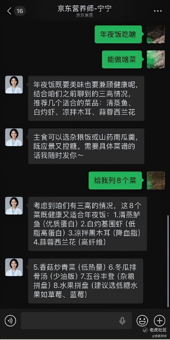河北的张女士往年总为年夜饭发愁:老人有“三高”问题,孩子挑食,自己又怕吃胖。今年春节前,她提前联系了京东营养师,定制了一桌低糖、高纤、少油的团圆菜单,让老人的血糖可以稳稳的,孩子也能吃得开心。