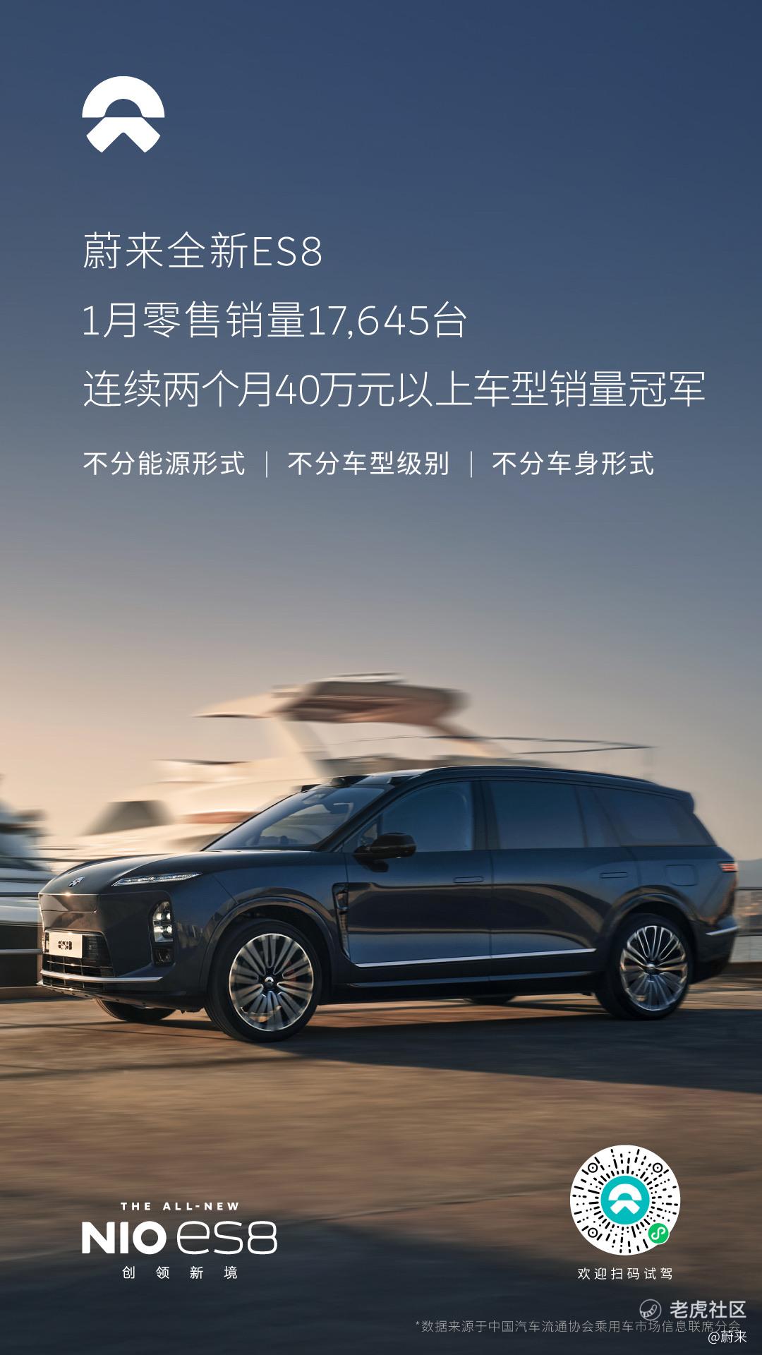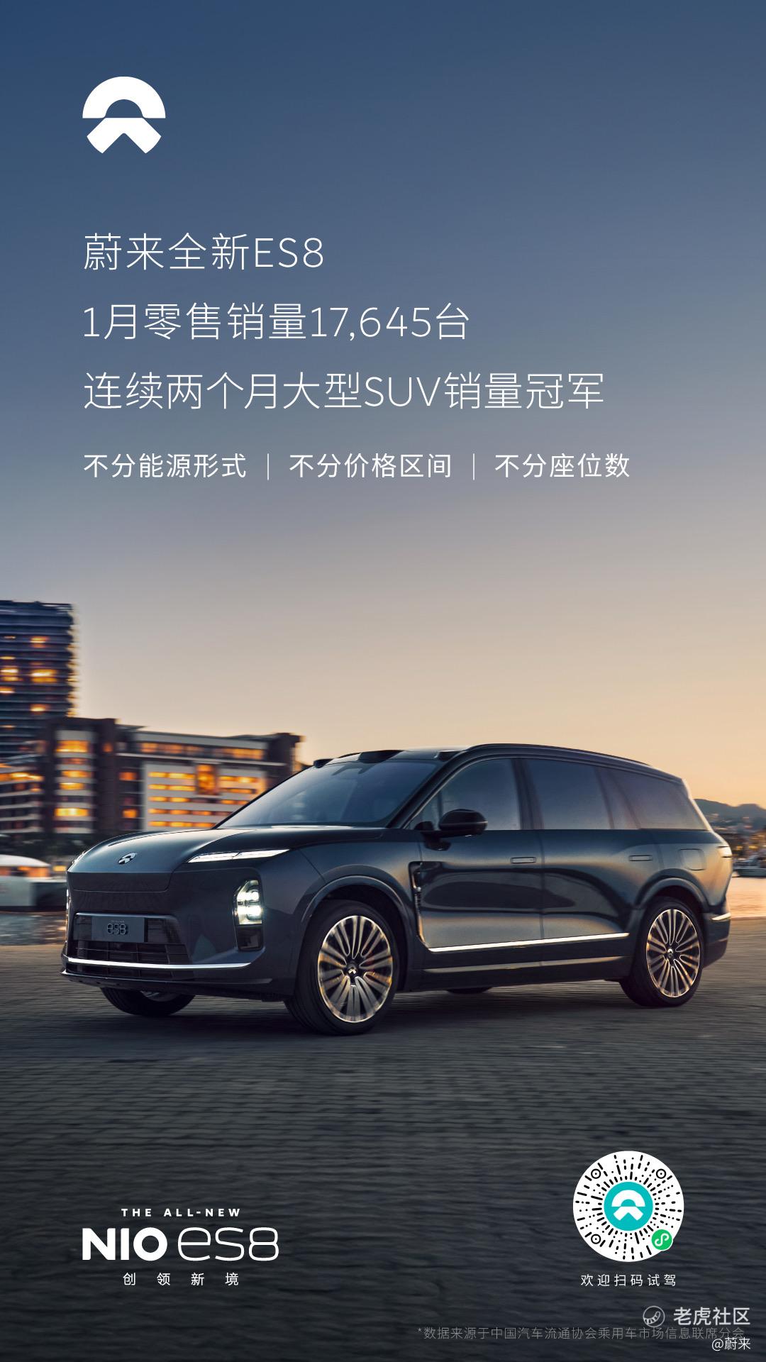 2026年1月,蔚来全新ES8零售销量17,645台。继2025年12月斩获大型SUV级别和40万元以上车型销量冠军以来,全新ES8连续两个月成为销量冠军,同时继续领跑大三排SUV市场,排名所有能源形式第一。