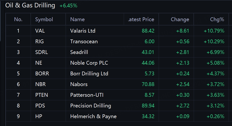 油气钻井板块大涨 +6.45%|VAL、RIG 双双涨超10%,海上钻井迎来修复行情?