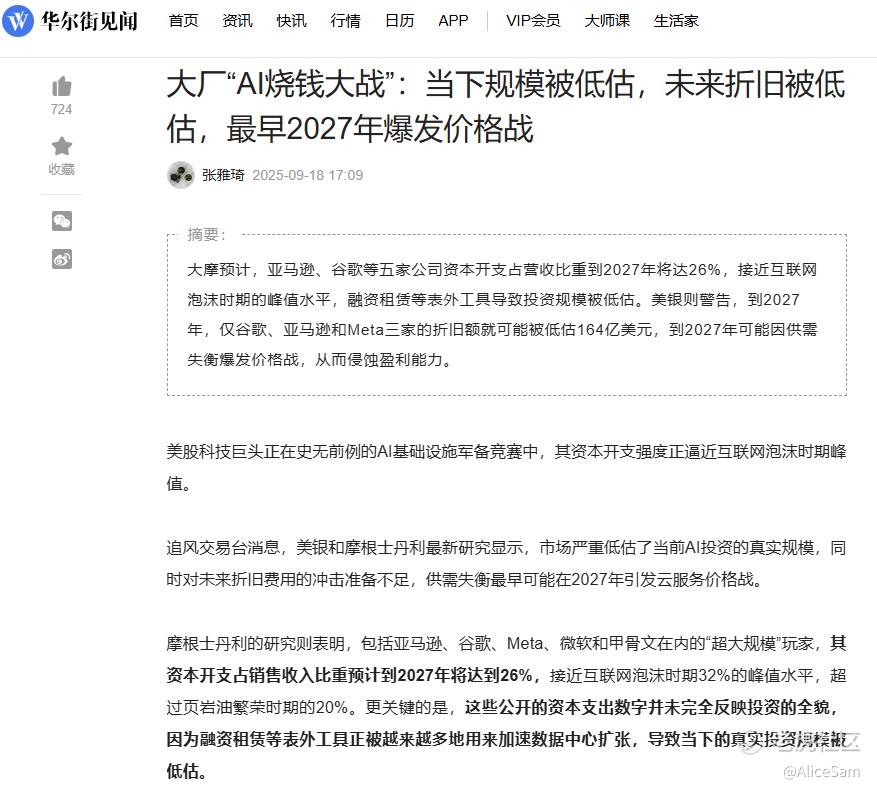 去年9月的新闻就已经在聚焦大厂们的AI烧钱大战了,摩根士丹利的报告甚至将当前的AI投资潮与历史上的两次资本狂热进行了对比:一次是互联网泡沫时期的电信业光纤建设,另一次是页岩油革命中的能源业钻探。报告指出,当前的资本强度正在逼近前者的峰值。