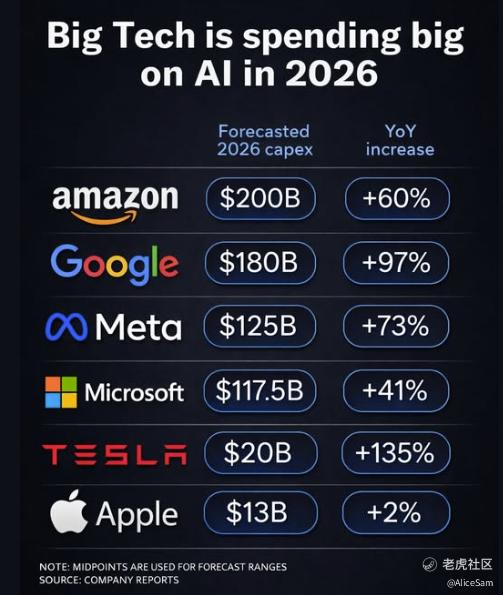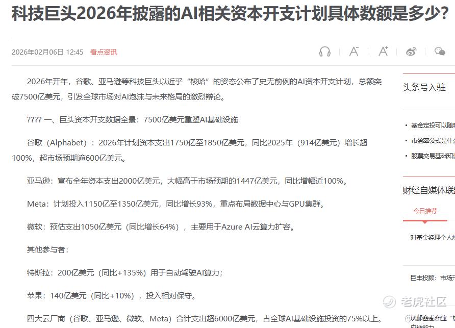 至于2026年的AI开支具体数据,也有新闻报道了出来。 $亚马逊(AMZN)$ , $Meta Platforms, Inc.(META)$ 等科技巨头们以近乎“梭哈”的姿态公布了史无前例的AI资本开支计划,总额突破7500亿美元![你懂的] 这样还不够, $谷歌(GOOG)$ 甚至通过发行债券的方式 “向天再借一百年”,他们Alphabet已计划发行一种极其罕见的百年期债券![惊讶]