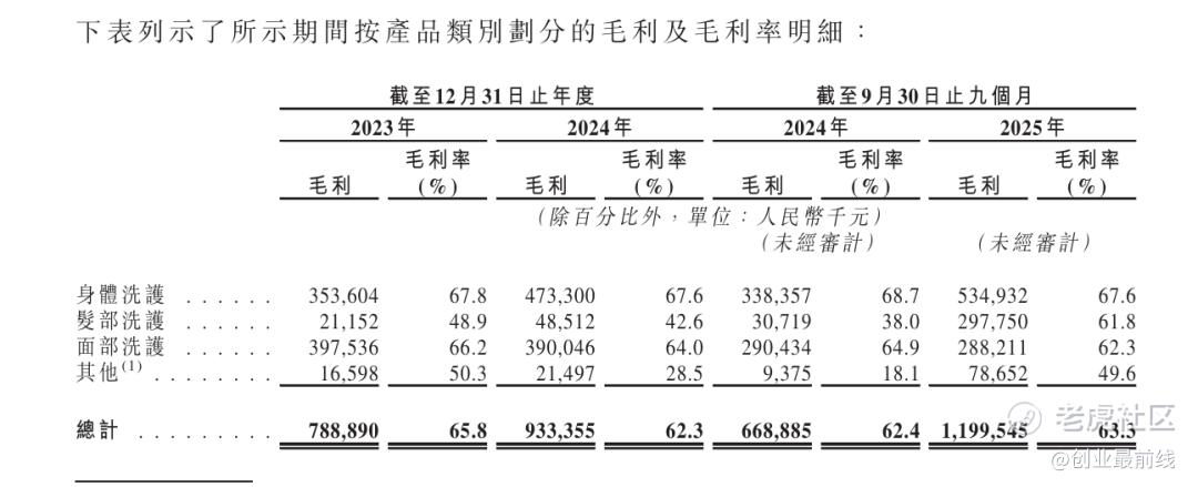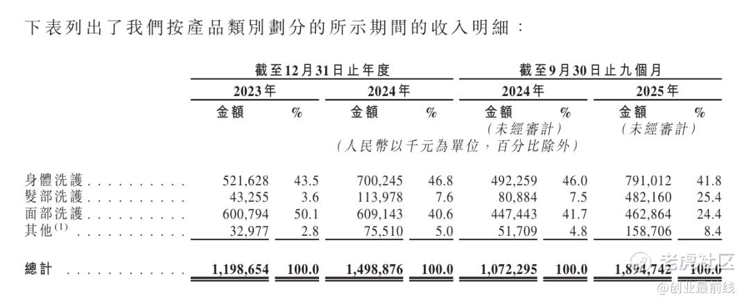 而发部洗护的表现尤为突出,其收入从2023年的0.43亿元升至2025年前九个月的4.82亿元,收入占比达25.4%(超越面部洗护的24.4%),增速最快,成为拉动业绩增长的核心动力所在。