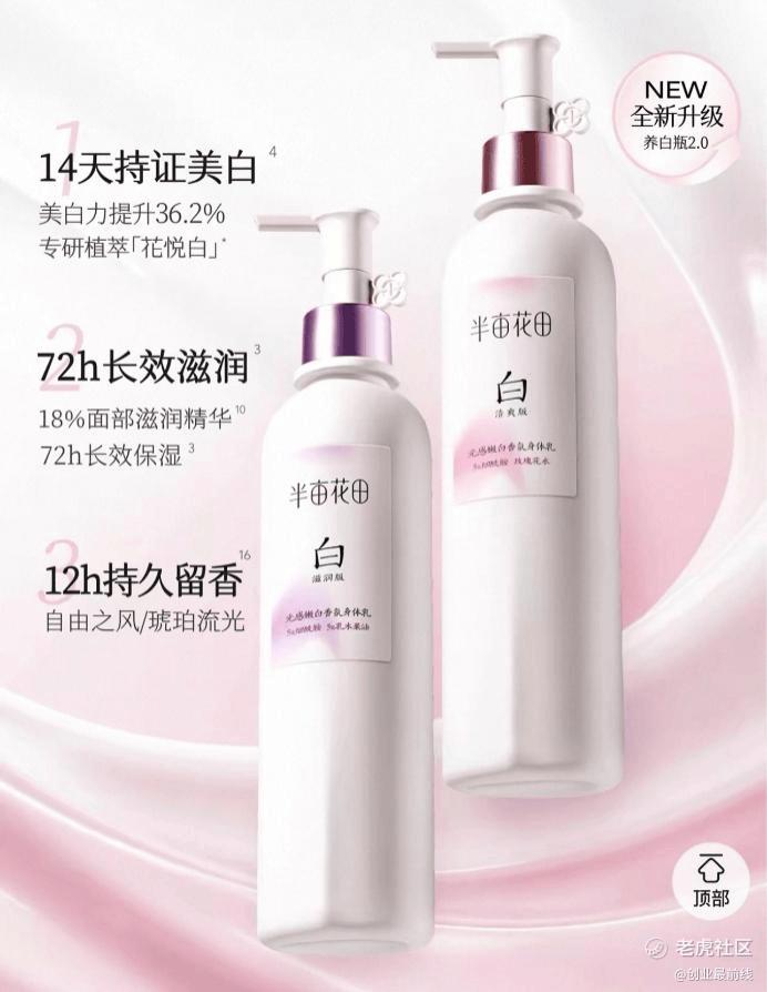 以身体乳为例,半亩花田身体乳产品线早在2012年就已上市,但现在卖的最好的是2023年推出并在随后两年升级的美白身体乳。