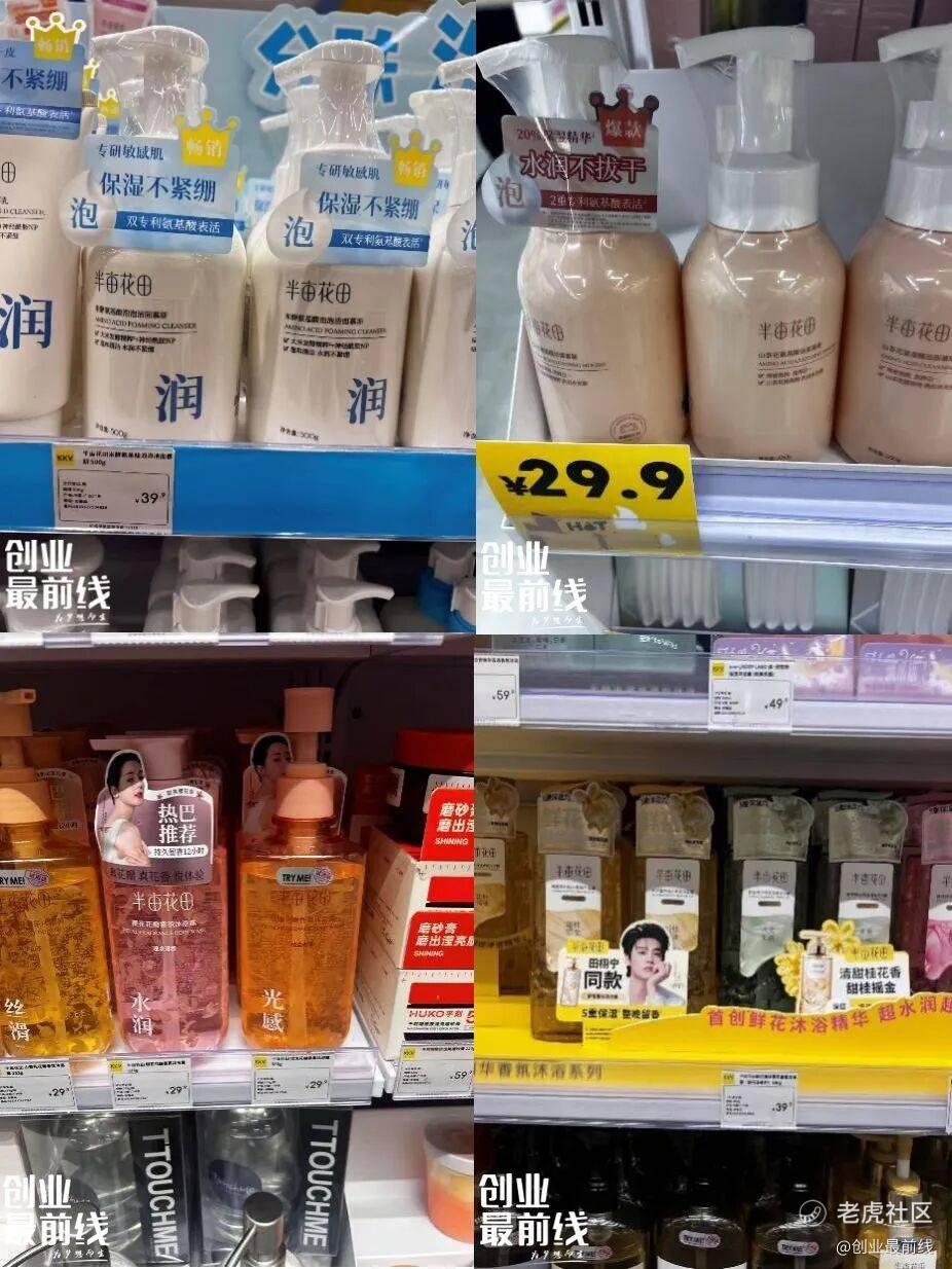 近日,在美妆集合店KKV北京的一家门店,「创业最前线」记者看到,货架上摆放的半亩花田氨基酸洁面产品,不仅容量大,普遍为350g、500g,售价则是29.9元、39.9元不等。而沐浴露产品,同样也是在29.9元——39.9元价格带居多。