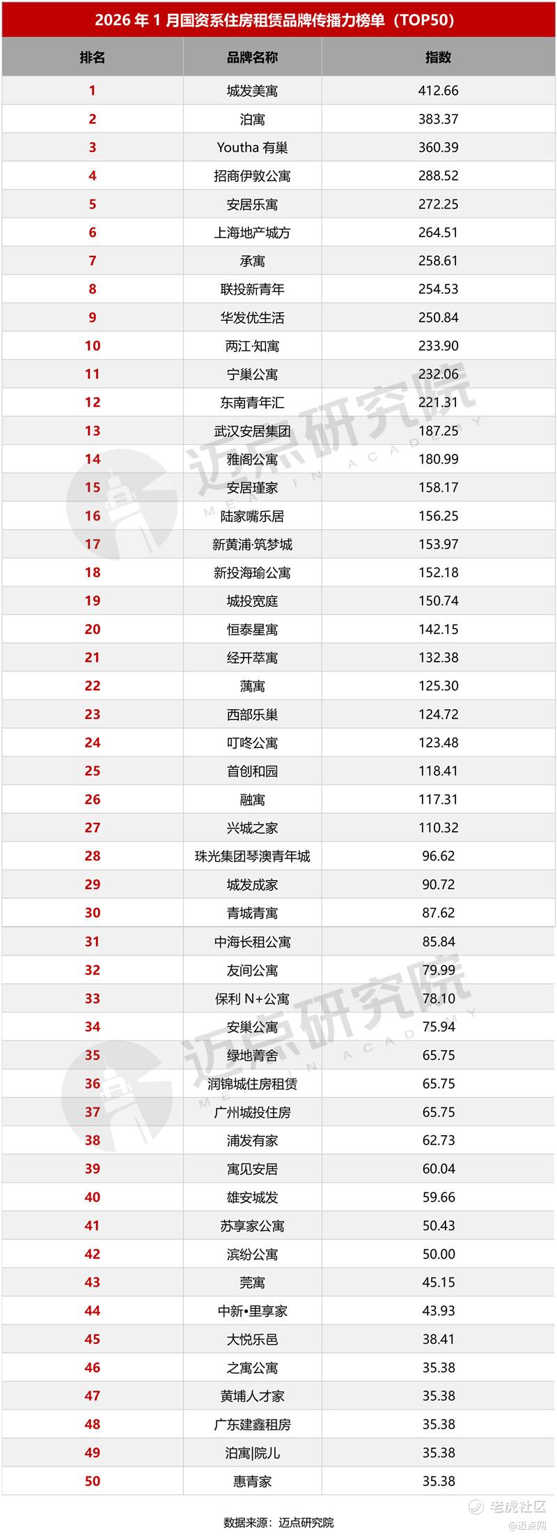 2026年1月国资系品牌传播力TOP50榜单显示,头部国资系品牌格局保持高度稳定。“城发美寓”、“泊寓”、“Youtha有巢”稳居前三,显示出全国性国资品牌已建立起显著的规模与认知优势。与此同时,部分区域型品牌的排名跃升与新品牌的出现。“安居瑾家”与“新投海瑜公寓”排名显著提升,主要得益于其所在区域保障性租赁住房重点项目政策的支持与宣传。“叮咚公寓”、“青城青寓”等新晋品牌进入榜单,则反映出更多地方国资平台正积极入局,品牌化进程加速。榜单后段品牌指数集中且位次流动频繁,体现了市场化初期竞争的活跃度。整体而言,国资系品牌榜单反映出在政策框架下,行业竞争正从资产规模的“持有阶段”深化至运营效率与品牌价值的“精耕阶段”。未来,能否在履行保障职能的同时,构建差异化的产品力与专业的运营能力,将成为国资品牌在行业深化期中确立自身地位的关键。