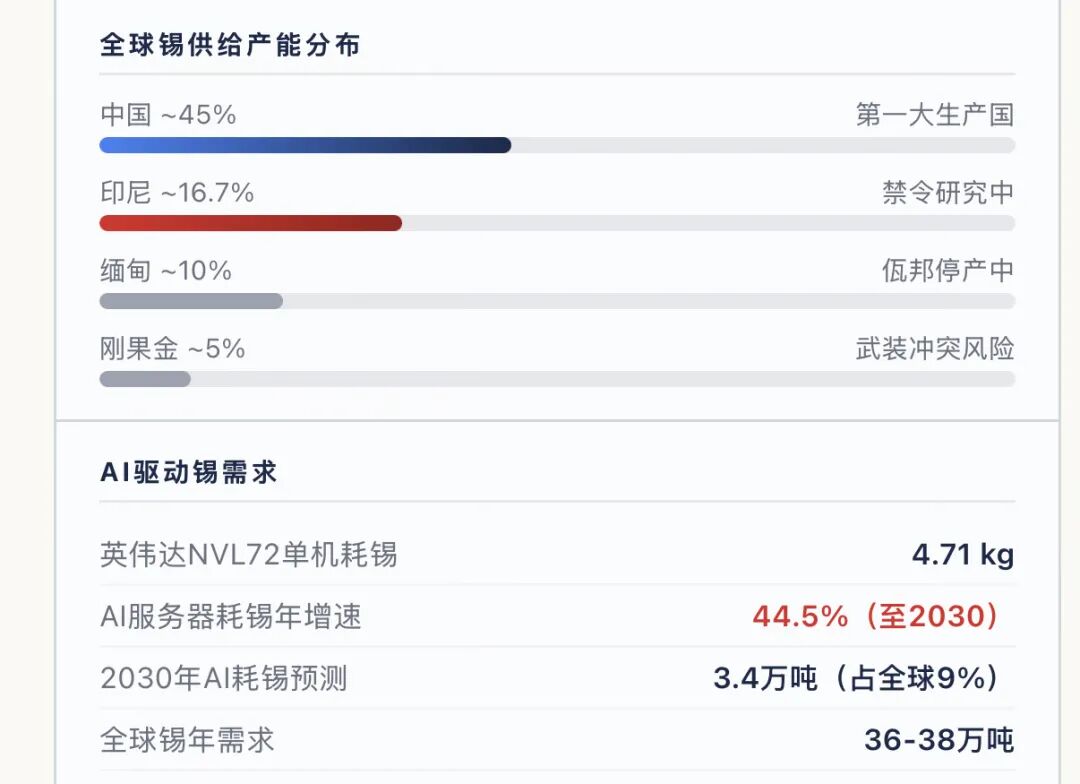 锡是AI服务器、半导体封装、光伏组件的关键焊料。英伟达NVL72单机耗锡4.71kg,AI算力需求每推高一轮,锡的消耗就跟着翻一番。印尼这张牌一旦打出,影响远不止大宗商品市场。