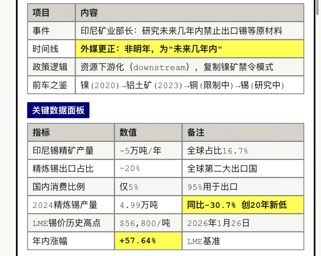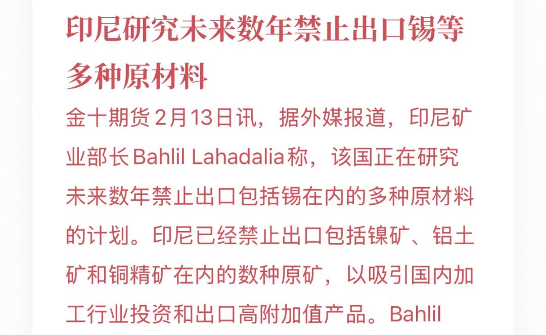 2月13日,印尼矿业部长公开表示正研究在未来几年内禁止出口包括锡在内的若干原材料。