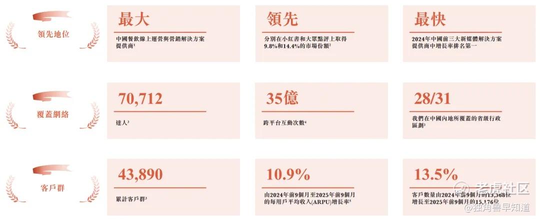 截至2025年9月30日,公司与大众点评、抖音平台及通过第三方代理机构的超过70,000位达人合作,截至2025年9月30日止九个月,公司赋能在小红书、抖音及大众点评等平台上约464,410条帖子及视频的创作,累计产生逾35亿次互动。