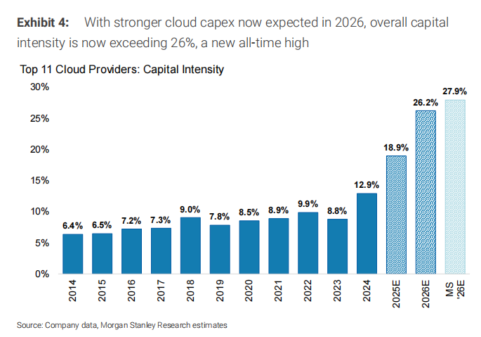 事实上,若我们回到一年前(2024 年第四季度财报前),2025-2026 年全球云资本支出合计预测为 7100 亿美元。今天,预测为 1.2 万亿美元,或增量支出 5000 亿美元,相当于总收入的 26%,约为 2014-2023 年资本支出强度平均值的 3 倍(图表 4)。