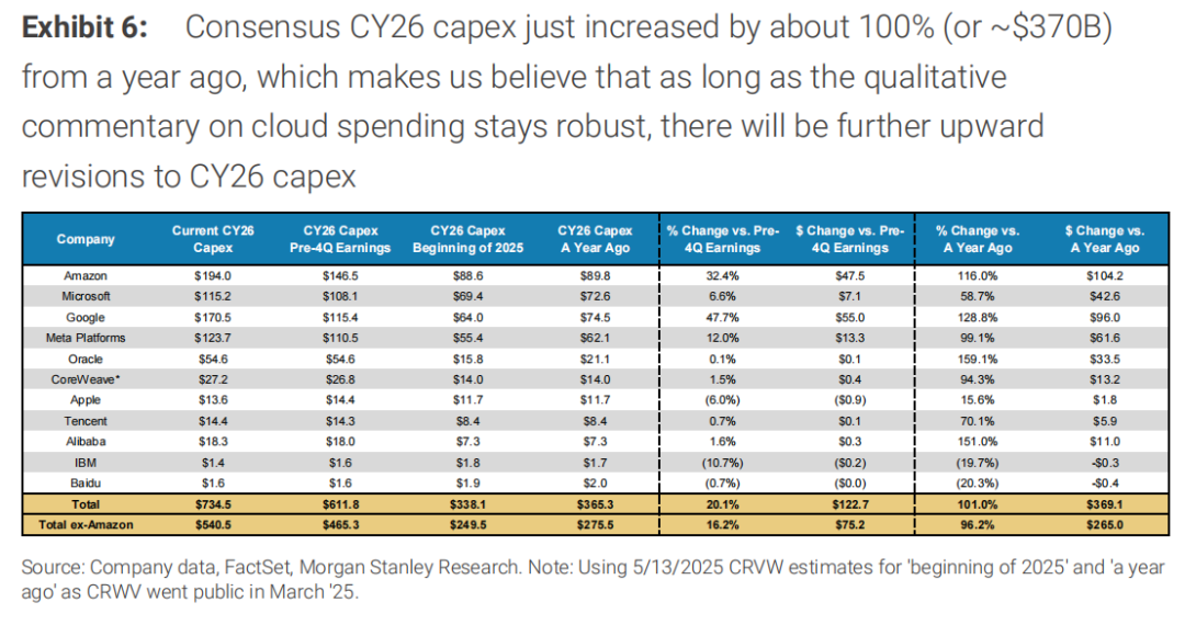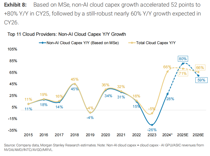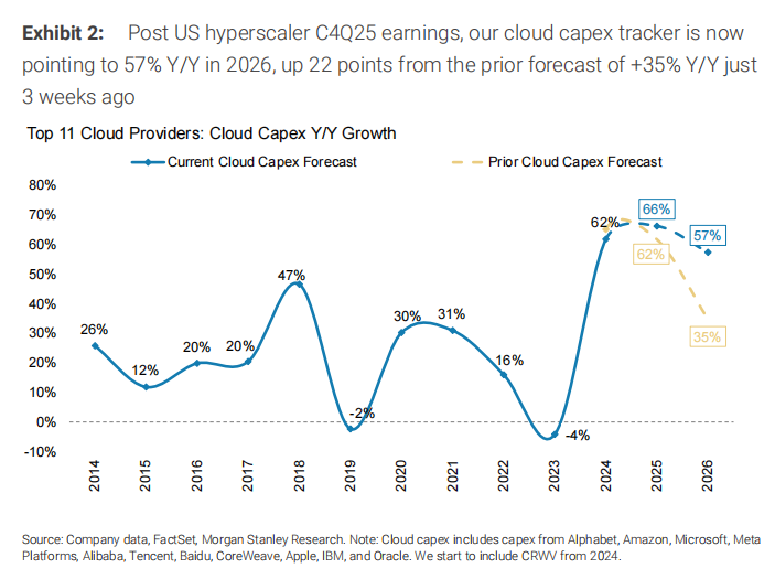 虽然 2026 年 57% 的同比增长意味着较 2025 年放缓 9 个百分点,但这也将标志着前 11 大云资本支出方连续第三年集体实现约 60% 以上的资本支出增长,这是我们云资本支出追踪历史上前所未有的。若一致预期云资本支出估计从此处上调,我们不会感到意外,鉴于