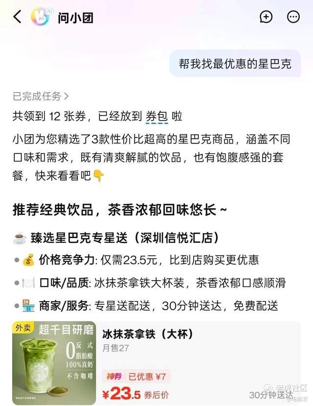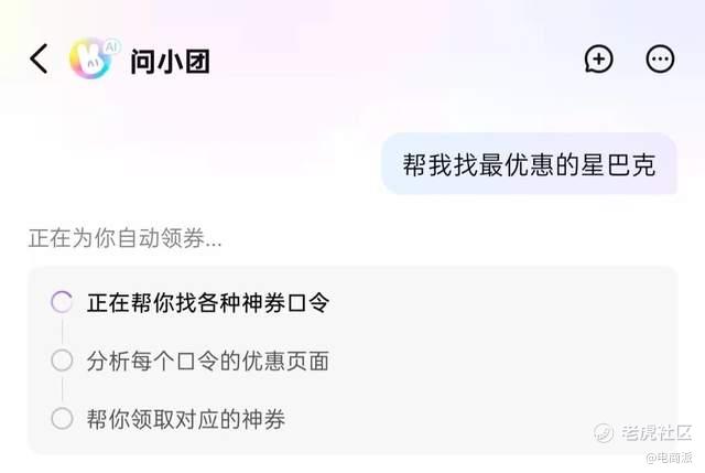小孟实测,在对话框中输入“帮我找最优惠的星巴克”后,小团会触发优惠查询功能。在执行任务的过程中,它还会进行自动领券流程——“正在帮你找各种神券口令”“分析每个口令的优惠页面”“帮你领取对应的神券”,分三步执行任务。