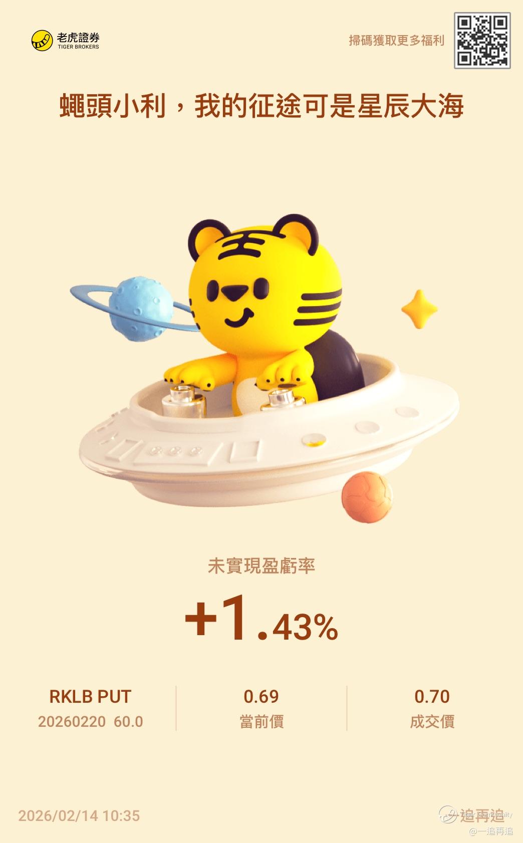 风险方面,航天行业 inherently 高风险,发射失败或技术延误可能重创股价;宏观利率环境亦影响高增长股的估值水平。然而,太空经济的长期趋势不可逆转,卫星通讯、地球观测、国防安全等需求刚性强劲。Rocket Lab作为「纯太空股」的稀缺标的,具备技术护城河与先发优势,回调正是长线布局的良机。投资者可考虑分注吸纳,目标价看回80-90美元区间,止损设于55美元下方。$RKLB 20260220 60.0 PUT$