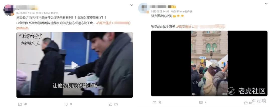 粉丝当然不会错过这个看戏的机会,闻着味儿就赶过来了:混入现场的粉丝看到张呈一会儿爬树摘冰棍,一会儿被尔滨的天气冻出痛苦面具,表情包一个接一个;场外的活儿也少不了,有粉丝喊他催好兄弟程相多出来营业,张呈反手就是一顿隔空“凡尔赛”:“程相,我又接商务了!”还真是既怕兄弟过得苦,更怕兄弟不知道我开路虎……