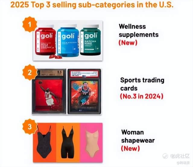 具体到不同市场,也存在一定的需求差异。比如美国市场,运动户外和保健是美妆个护和女装之外的两大热门品类;这一年里,保健补充剂、球星卡、女性塑身衣是三大最畅销单品。