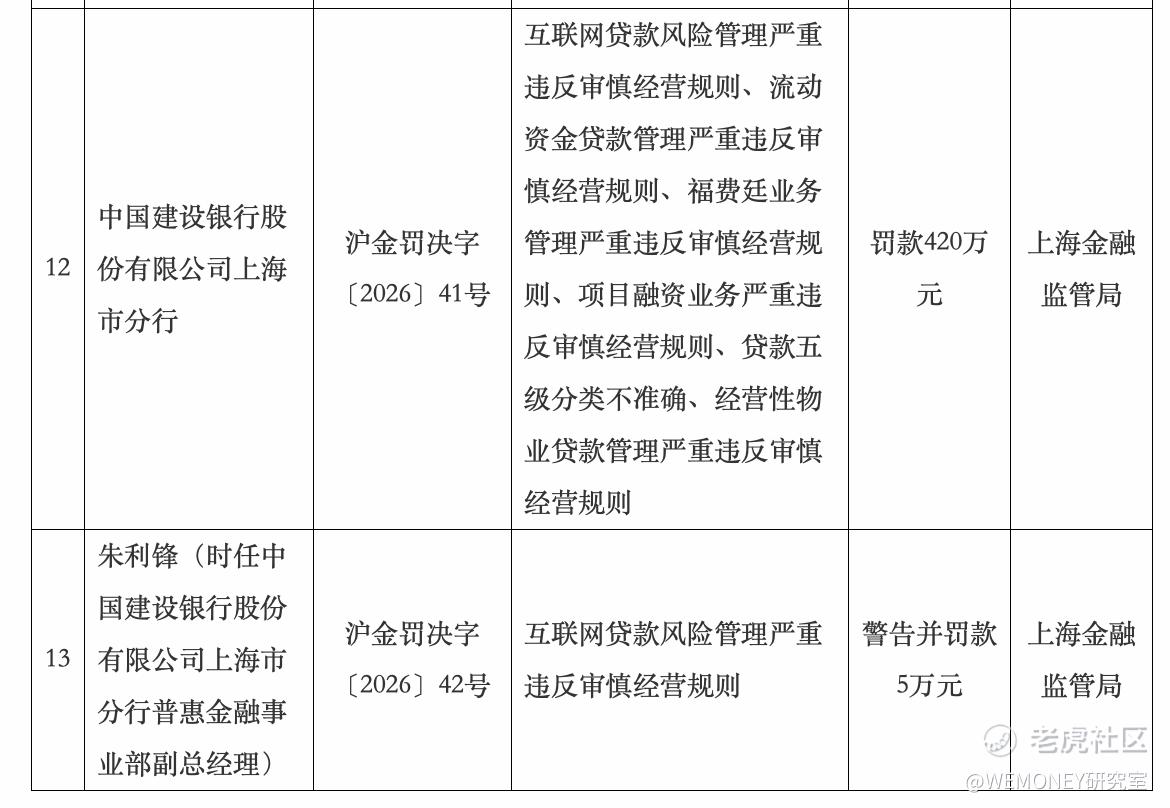 2月14日,国家金融监督管理总局上海监管局行政处罚信息公开表显示,中国建设银行上海市分行,因互联网贷款风险管理严重违反审慎经营规则、流动资金贷款管理严重违反审慎经营规则、福费廷业务管理严重违反审慎经营规则、项目融资业务严重违反审慎经营规则、贷款五级分类不准确、经营性物业贷款管理严重违反审慎经营规则,被罚款420万元。