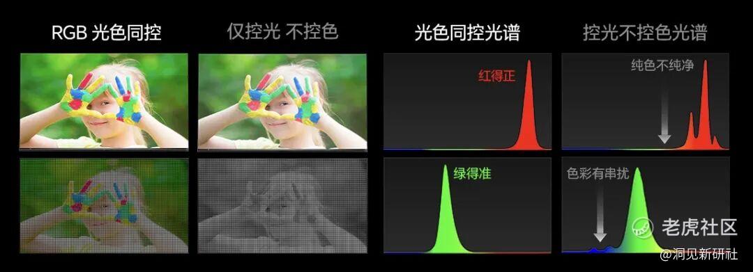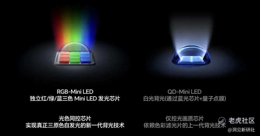 我们先来看以RGB-Mini LED/Micro LED为范本的“原生彩色光”技术,因为光源直接发出纯净的三原色光,从而具备了代际性优势。