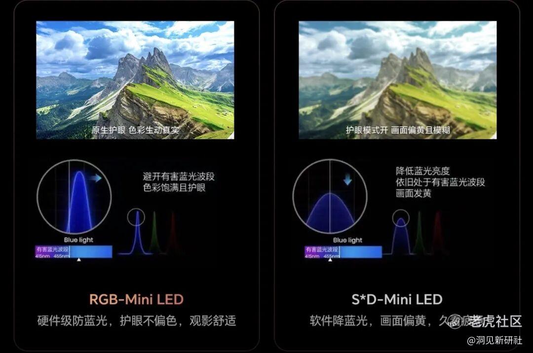 再者,在视觉健康与舒适方面,RGB-Mini LED/Micro LED无需依赖高能蓝光去激发其他颜色,可以从光源物理层面优化光谱,直接将量子点Mini LED有害的短波蓝光的比例大幅降低。这意味着在获得鲜艳画质的同时,实现了真正的“护眼不偏色”,解决了用户长期观看的疲劳痛点。