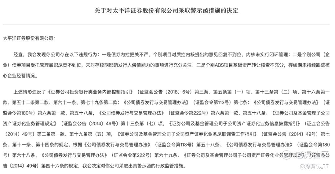 太平洋证券则被指出存在三方面问题:债券内控把关不严,个别项目对质控、内核意见的回复不到位,内核管理未形成有效闭环;受托管理履职不充分,未对存续期内可能影响发行人偿债能力的事项给予足够关注;部分资产证券化项目在基础资产转让环节核查不足,存续期内亦未持续跟踪核心企业经营状况。