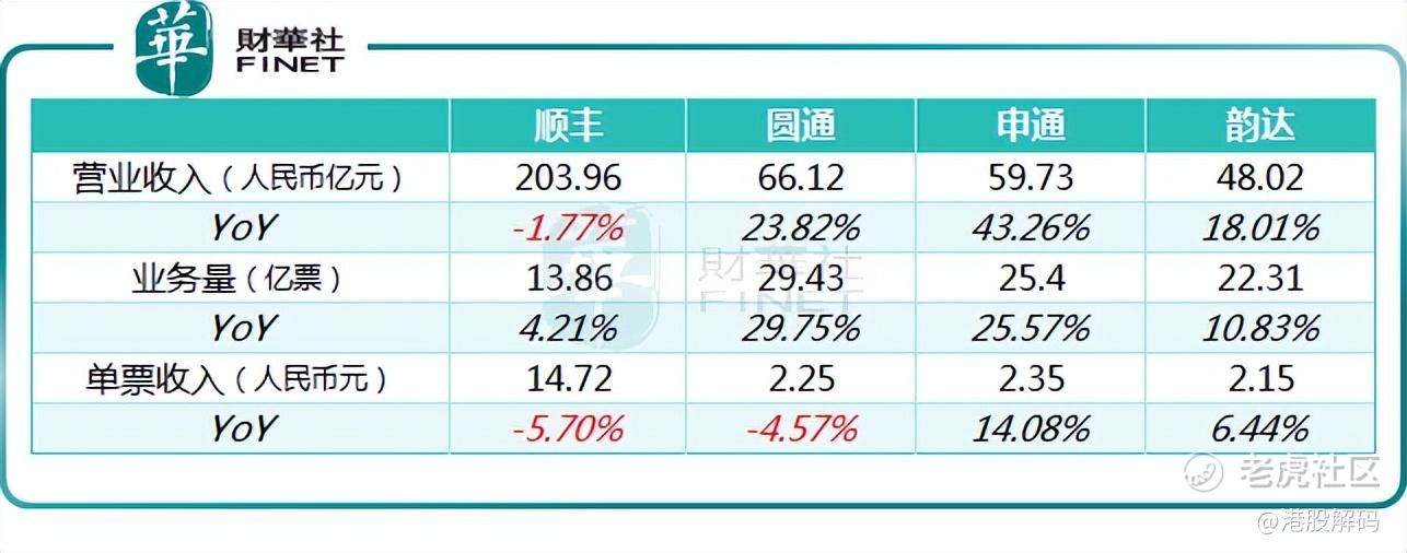 从上表可以看出,以上四家企业,除顺丰(以顺丰速运物流业务为比较基准)外,其余均实现收入同比增长,增速最快的为 $申通快递(002468)$ ,增速达43.26%。 $圆通速递(600233)$ 与韵达股份(002120.SZ)表现亦上佳,分别达23.82%与18.01%。