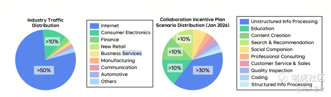 左边的饼状图显示了行业流量分布,互联网占据了主导地位。右边的饼状图显示了企业客户使用场景的分布,其中非结构化信息处理、教育、内容创作和搜索推荐是当前主要需求场景。