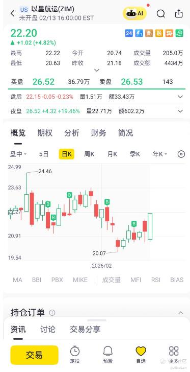 新年第一天,发现持仓里的一只股票 $以星航运(ZIM)$ 突然暴涨,真开心啊。[开心] 虽然我手里只有200股,其中有100股还被下周到期的Covered Call套住着,我也是满意了,毕竟这只股票的持仓价,早就干到了负数,我是零成本持有着的。
