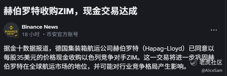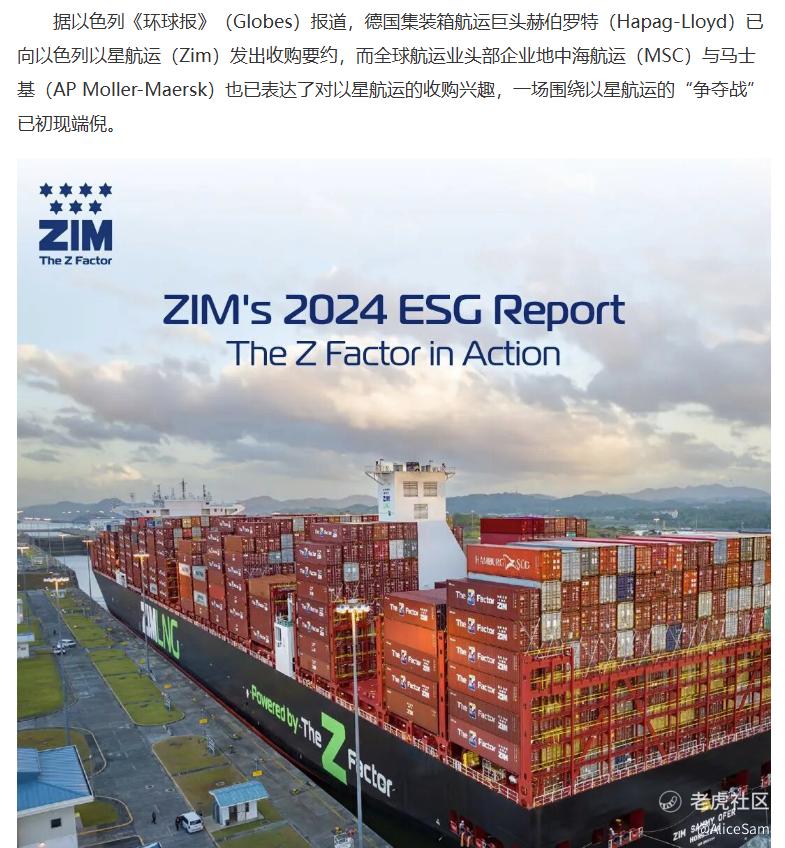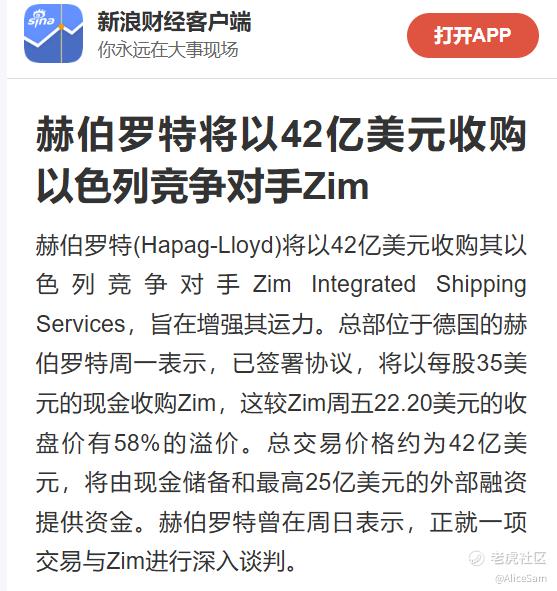 那今天为什么突然就大涨20%呢,我查了查好些新闻,原来是因为一张金额高达42亿美元的收购案。德国航运巨头赫伯罗德宣布以42亿美元全现金收购以星航运![财迷] 如果这交易能成,那将是航运业十年来最大规模的跨国整合之一,HPGLY已经是第五大班轮公司,ZIM是排在第十位的,两者强强联合,整合后将有能力向 MSC、马士基等巨头更直接竞争。