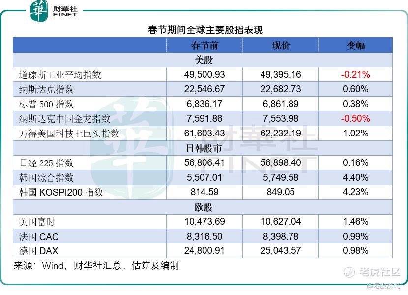 纵观农历新年期间全球资产表现,市场呈现明显的分化格局。美股科技巨头在AI利好消息推动下企稳反弹,欧股及日韩股市普遍上涨,但中概股却逆势走弱,这为港股年后开市带来一定压力。恒生指数低开低走、一度跌超1%的表现,正是这一外围环境变化的直接反映。