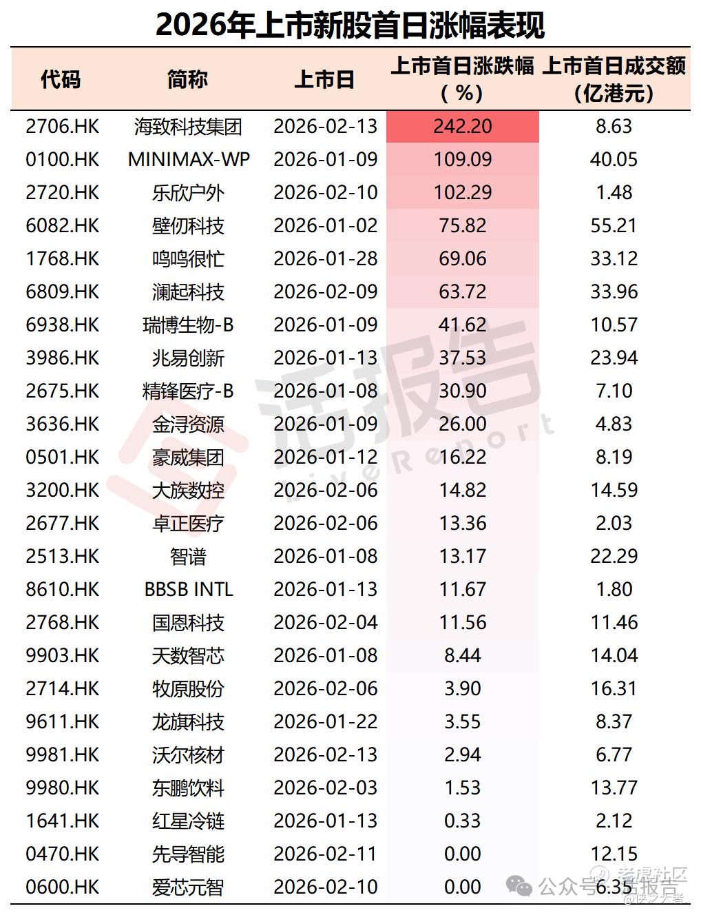 2026年上市的香港新股于上市首日“零”破发,其中海致科技集团成为首日股价涨幅最高的新股。