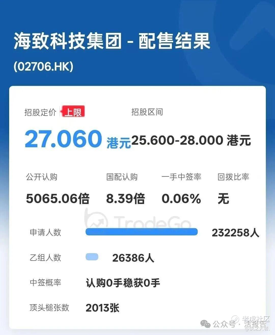 配售结果显示,海致科技集团本次申购人数共23.23万人,公开认购高达5065.06倍,其中,顶头槌共计2013张,但也不能稳中一手,一手中签率仅有0.06%,国配则认购8.39倍,热度也不错。