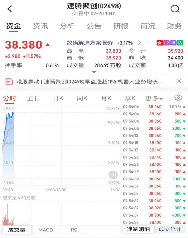 受此利好影响,速腾聚创股价于2月20日早盘高开高走,盘中一度上涨至39.8港元,最大涨幅15.7%。