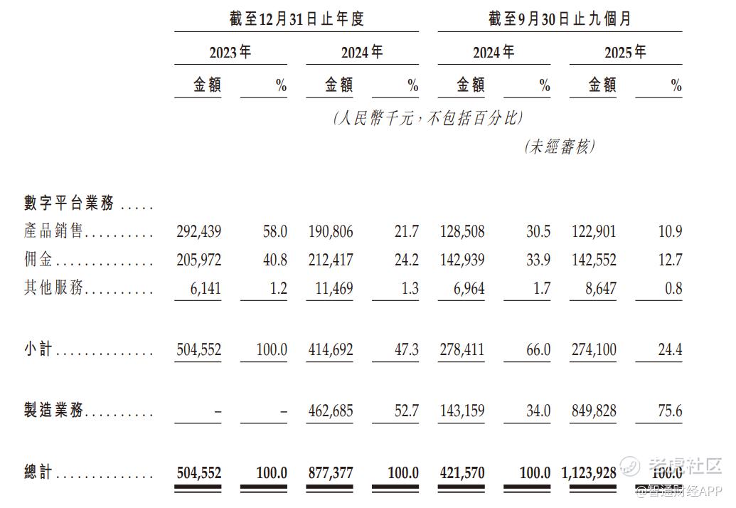 与爆发式成长的制造业务相比,数字平台业务的发展则相对“萎靡”。2023、2024年,鑫谊麟禾的数字平台业务的收入分别约为5.05亿、4.15亿元,至2025年前三季度,该业务收入为2.74亿元,较2024年同期有小幅度下滑。