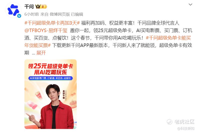 然而,就在豆包和元宝在红包与社交的战场上贴身过招时,千问却悄悄绕到了大后方,祭出了一套极具侵略性的升维打击:不仅独家冠名“2026河南春节晚会”,更在2月14日突然宣布:追加30亿“超级免单卡”。