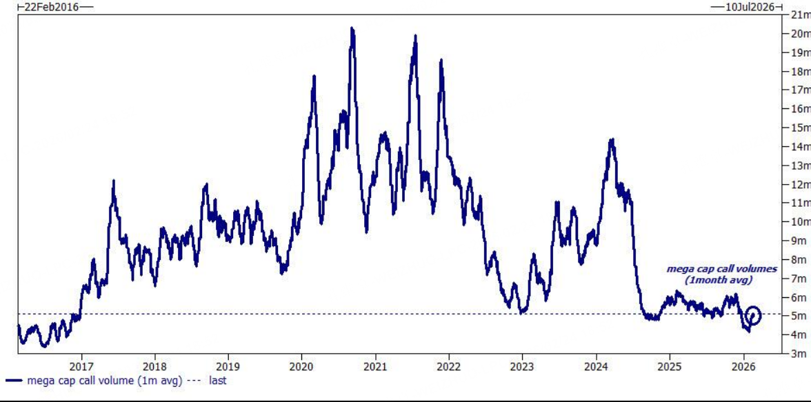 另外,我们看期权数据里,高盛的报告中也提到,当前的大型股票的call的交易量几乎降到了历史最低,这也是很罕见的状态
