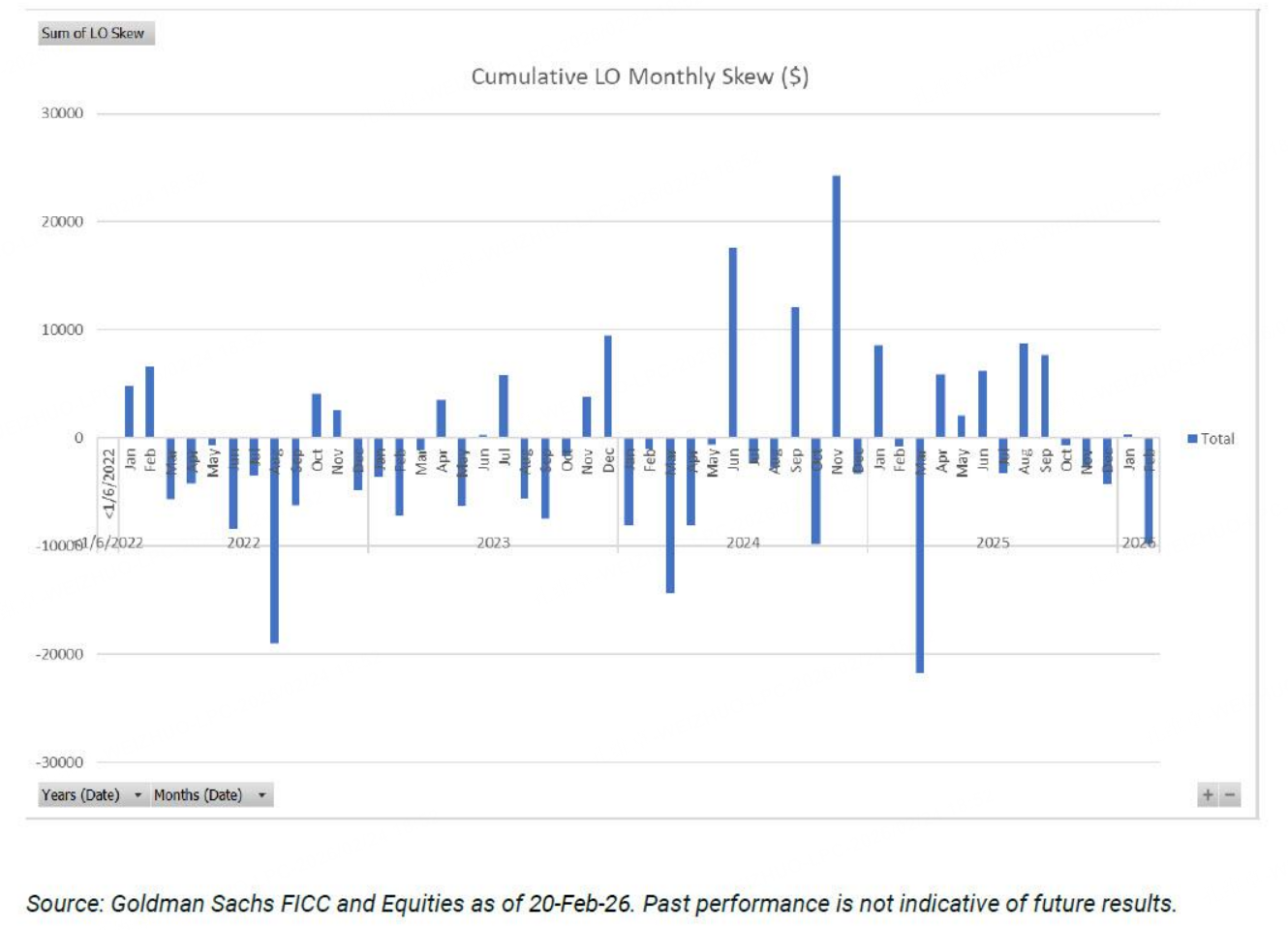 另外,在资金流向上,高盛的主要席位资金进出数据显示,资管机构在过去的2月的交易日里,(截止2月20日的月度数据)已经出现了罕见的大笔的抛售,幅度刷新近一年的新高