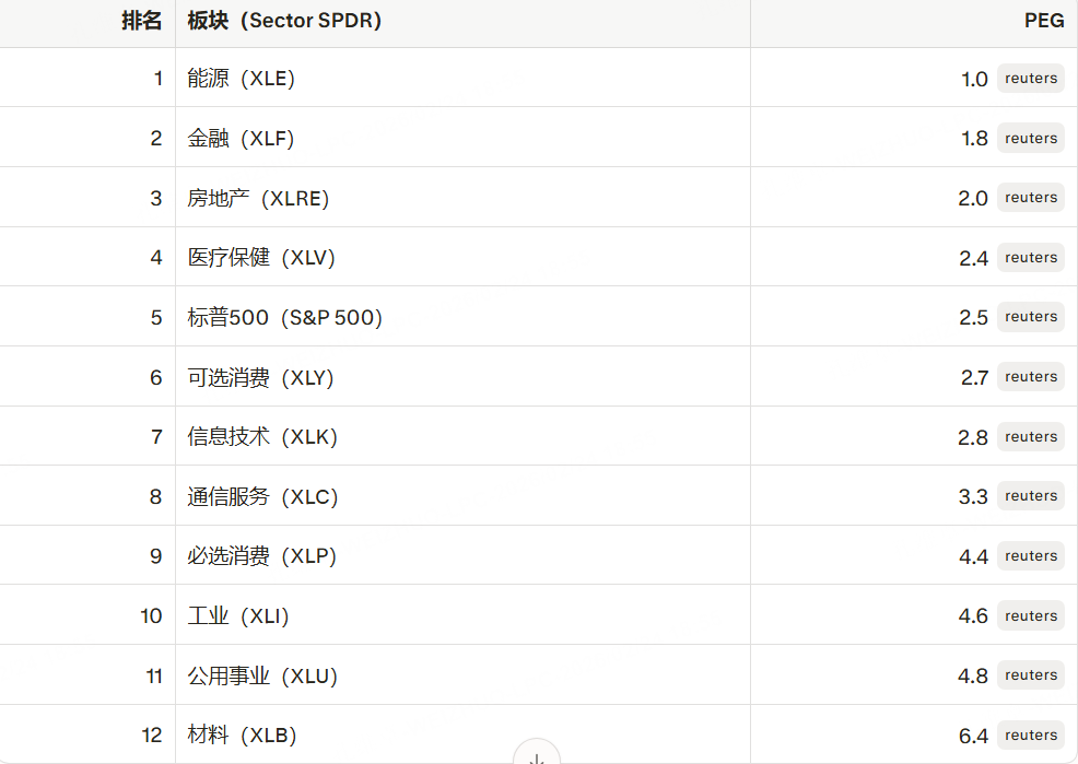 那么我们需要再多考虑一个维度就是他们这些板块的平均的增长率如何,如果用PEG这个指标来排出来目前的各板块的估值的话,可以看到,我们以2025年9月的数据来排出来各板块的PEG的排名