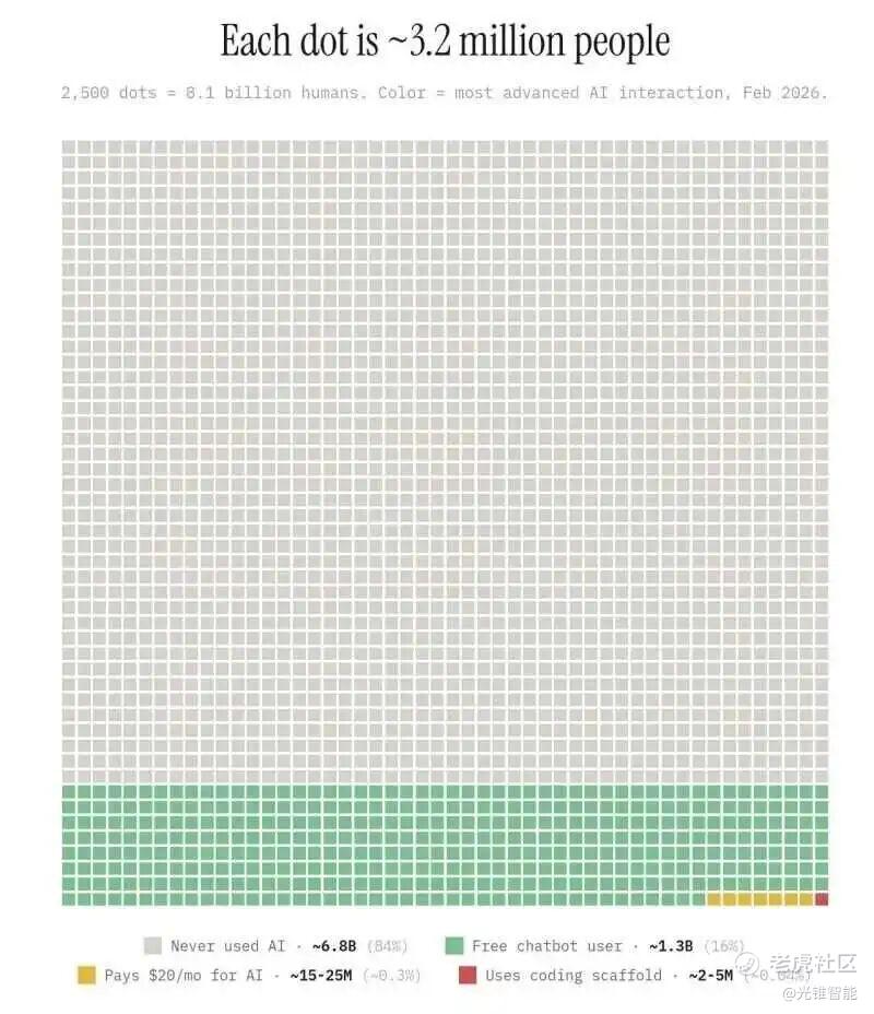 据X上发布的一张图片显示数据,全球81亿人中,有84%的人,即68亿人从未用过AI,而只有0.3%,即1500万到2500万人的用户愿意为AI付费。有16%的13亿人用过免费聊天机器人。