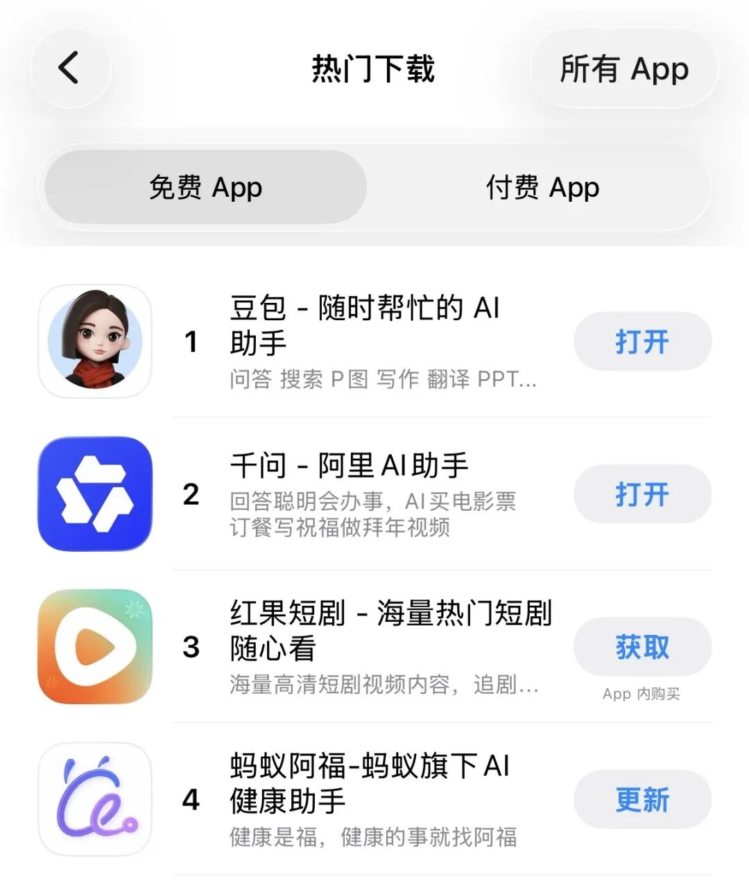 例外之一是垂类AI助手蚂蚁阿福。通过“健康福”活动、亮相央视马年春晚,以及返乡青年教家人用阿福的热潮,阿福App下载量持续飙升,连续多天登顶苹果App Store应用下载总榜第一。