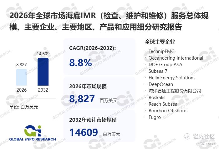 据GIR (Global Info Research)调研,2025年全球海底IMR(检查、维护和维修)服务收入大约8054百万美元,预计2032年达到14609百万美元,2026至2032期间,年复合增长率CAGR为8.8%。