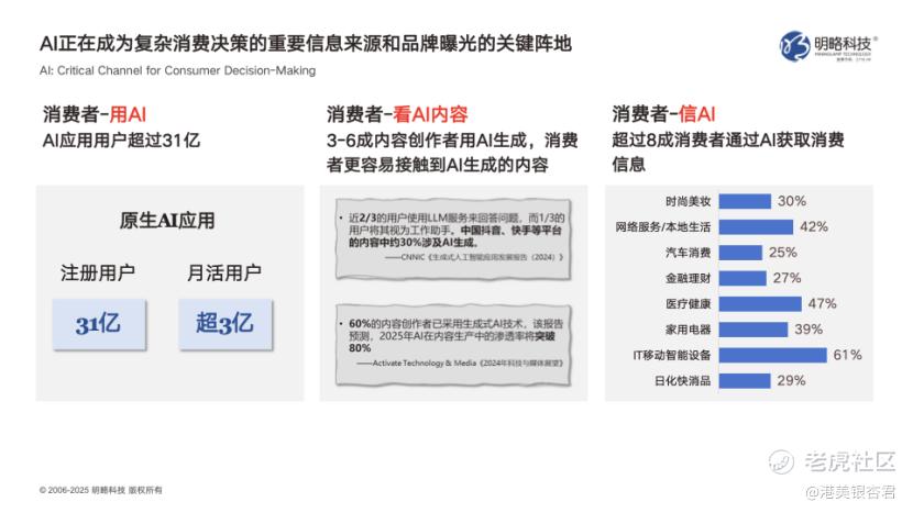 2025年初,明略正式推出GEO(生成式引擎优化)整体解决方案。很多人还没意识到这个赛道的战略价值。截至2025年底,原生AI应用全球注册用户已超31亿,中国月活用户超3亿。用户获取信息的习惯正从传统搜索向AI平台迁移,这意味着品牌营销的底层逻辑正在重构。