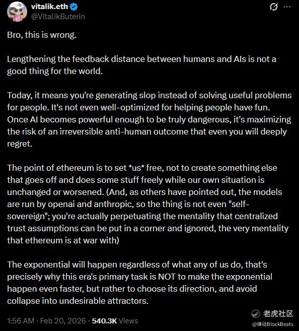 Vitalik 反对 Sigil Wen 的 Web 4.0 理念。他认为,一旦 AI 强大到足以构成真正的危险,就会最大限度地增加造成不可逆转的反人类危机,「指数增长」无论如何都会发生,所以这个时代的首要任务不是让指数增长发生得更快,而是要把控好它的方向。