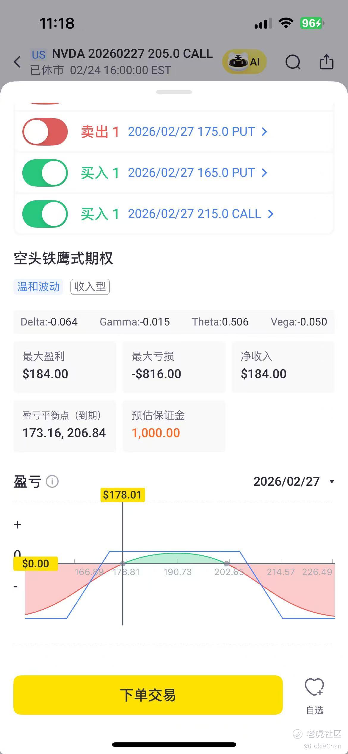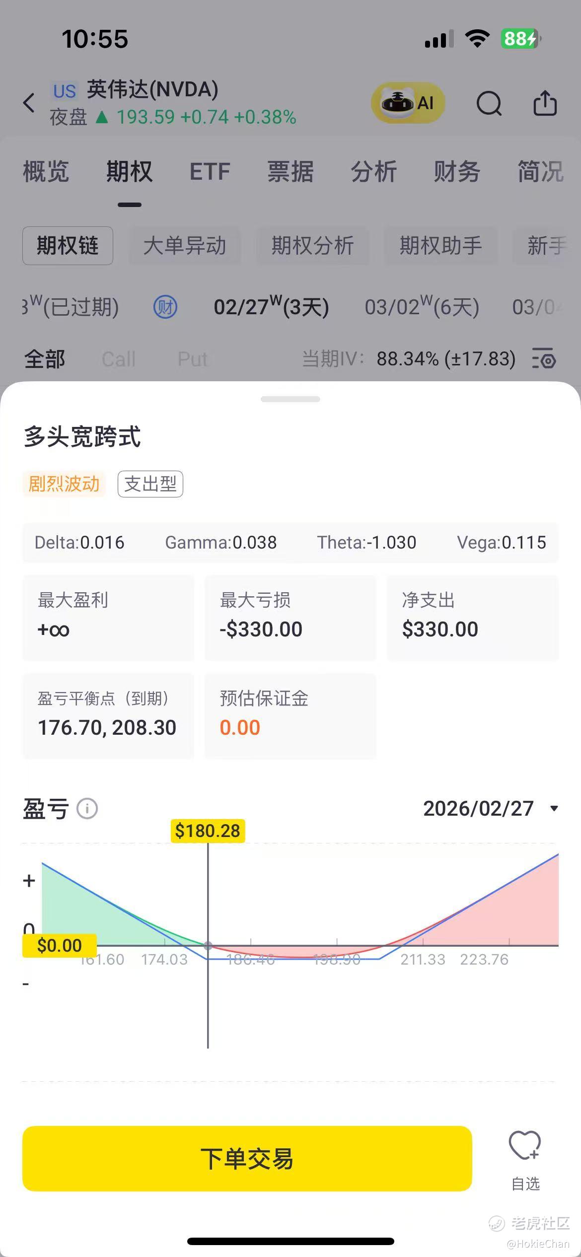 底层逻辑:投入约 $300/手。不赌方向,赌的是非涨即崩。只要突破 $208 或跌破 $177 即盈利