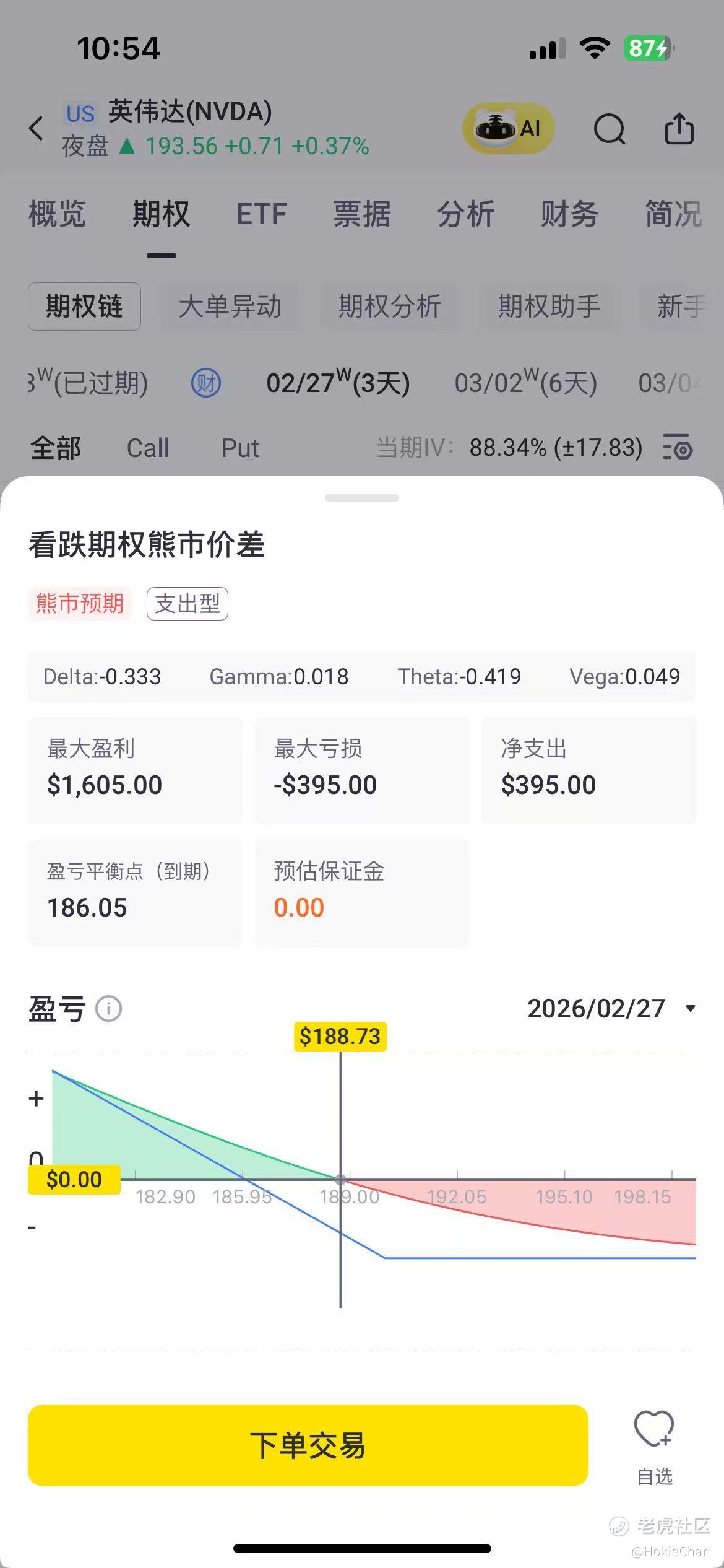 操作: 买入 190 PUT / 卖出 170 PUT(0227 到期)