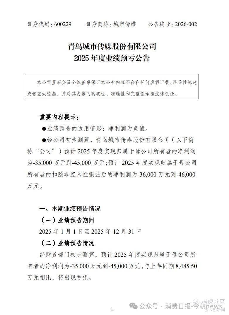 上市十年首亏!青岛城市传媒发布2025年业绩预告由盈转亏